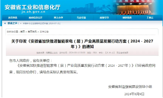 為推動“大家電做強(qiáng)、小家電做大、智能家居做優(yōu)、配套體系做全”,推進(jìn)安徽省智能家電(居)產(chǎn)業(yè)向高端化、智能化、綠色化轉(zhuǎn)型升級,近日,安徽省制造強(qiáng)省建設(shè)領(lǐng)導(dǎo)小組印發(fā)《安徽省加快推進(jìn)智能家電(居)產(chǎn)業(yè)高質(zhì)量發(fā)展行動方案(2024-2...