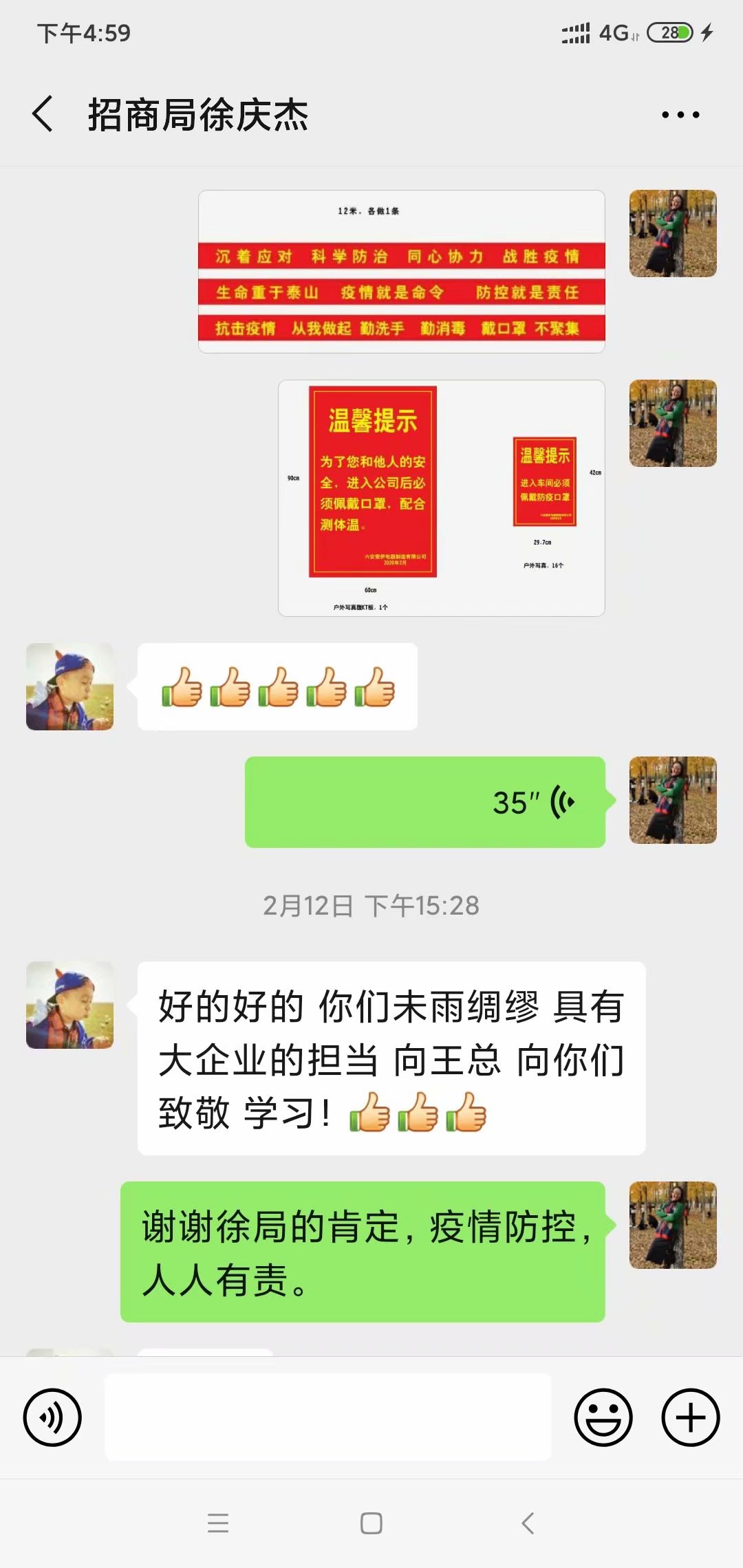 開發(fā)區(qū)派駐到我們索伊集團(tuán)的督導(dǎo)員是來自開發(fā)區(qū)招商局副局長徐慶杰,是一位年輕的,很帥氣,也很有親和力的80后領(lǐng)導(dǎo)。作為索伊集團(tuán)防疫總指揮的我,第一次與他接觸時是二月十二日,當(dāng)時我還放假在家,他主動打電話與我聯(lián)系,我當(dāng)時不認(rèn)識他,也從沒有接觸過他,他發(fā)送了一張名片也算是自我介紹吧,我才知道他叫徐慶杰,來自開發(fā)區(qū)招商局。他說他這次包保我們單位,我們倆很快加了微信,他第一時間把《六安開發(fā)區(qū)關(guān)于復(fù)工企業(yè)新型冠狀病毒防疫防控指導(dǎo)細(xì)則》、《復(fù)產(chǎn)復(fù)工外出來人員返工情況表》和政府的8號通告發(fā)送給我,同時還指導(dǎo)我如何制定防控預(yù)案,這些信息真是雪中送炭,正愁著馬上復(fù)工了,如何來向政府報告,一愁莫展時,他給予我很大的指導(dǎo),同時還把《致市民的倡議書》音頻資料發(fā)送給我,讓我們在復(fù)工復(fù)產(chǎn)的時候在廠區(qū)內(nèi)進(jìn)行播放,通過微信我得到了很多的信息和幫助。接下來的幾天時間里,只要有新信息,他都及時發(fā)送給我,并主動與我交流,希望在復(fù)工時一切都能有序安全。