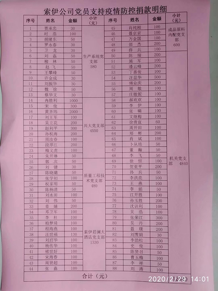 短短的半天時間,索伊廣大黨員共計捐款12380 元,其中機關黨支部捐款4840元,生產系統黨支部捐款580元,成品內配原料黨支部600元,質量工程技術黨支部捐款480元,興大公司黨支部4450元,索伊君瀾黨支部捐款1330元。一份份捐款帶著濃厚的情誼,一句句話語閃爍著黨性的光輝,匯聚成了索伊人的大愛無疆,形成了眾志成城抗擊疫情的濃厚氛圍,武漢,加油!中國,加油!沒有一個冬天不可逾越,也沒有一個春天不會到來!