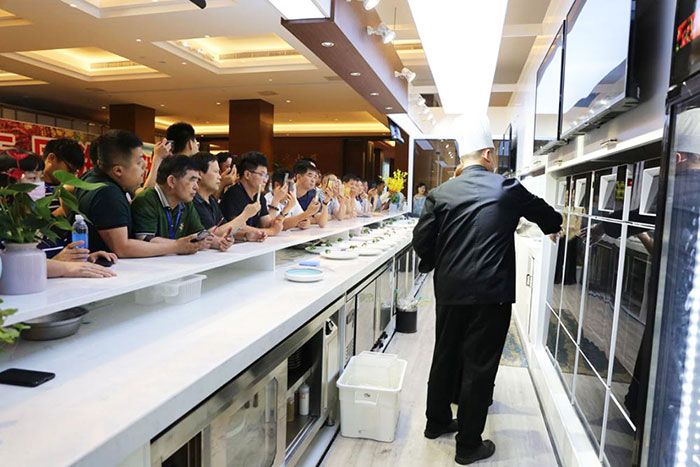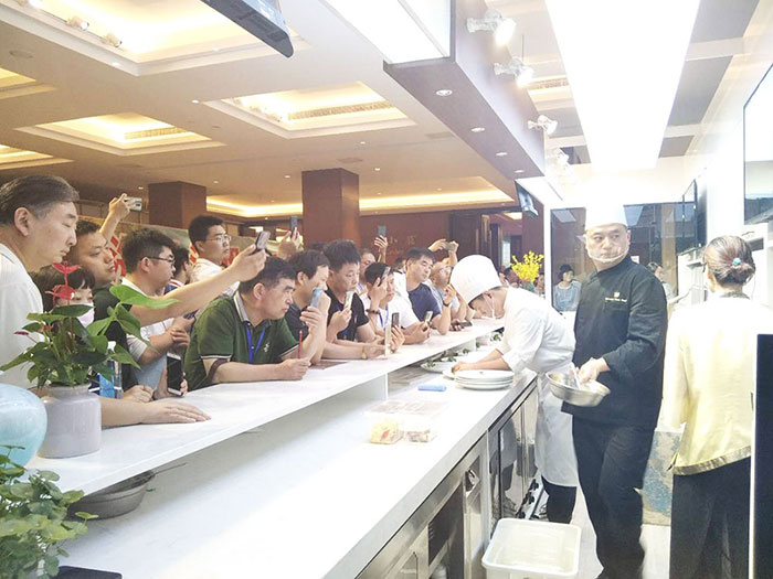 參會人員對酒店現(xiàn)場展出演示的味霸機器人廚師體驗館表示出了極大的興趣,紛紛圍觀拍照、咨詢體驗