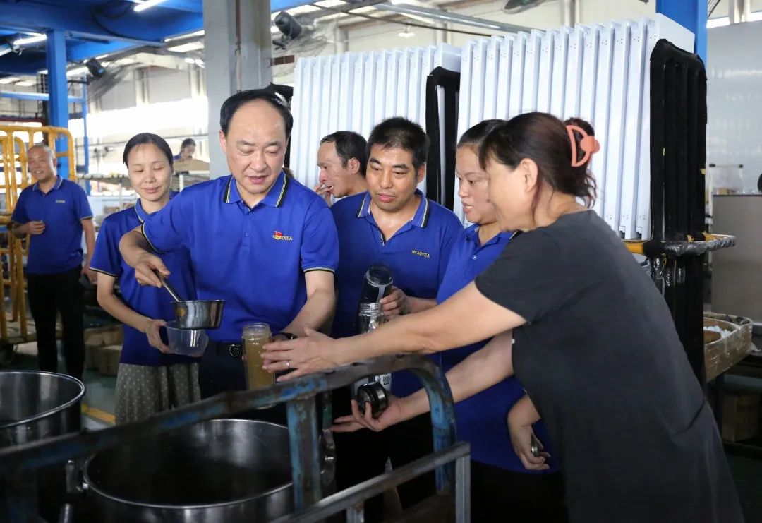 上午十點鐘,為體現公司領導對廣大員工的關懷,公司董事長助理倪曙東、黨委書記汪顯華來到車間,不僅是看望大家,還為大家送來了清涼可口的綠豆湯。員工們非常的開心,笑著說“真是又熱又渴,這時候給我們送綠豆湯真是及時雨”,一杯又一杯,真是清涼又可口。