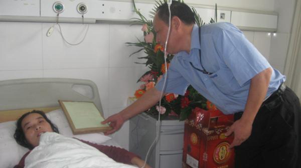 六安索伊電器制造有限公司工會主席陳勇代表公司向唐兆玉送上捐款和慰問品