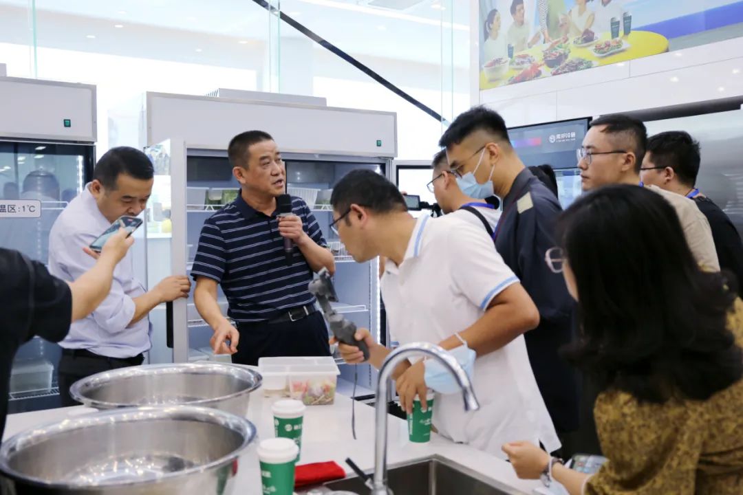 在公司的產品展示廳王瓊峰董事長親自向大家介紹了企業建廠以來傳統家電產品的發展和智能轉型產品的先進性。尤其在企業的轉型展示廳,董事長用了近一個小時的時間,詳細向全媒體記者們介紹了企業的發展歷程,特別是探索升級,智能轉型中遇到的困難、總結出來的發展要素、分析餐飲業的現狀,創造性提出二十一世紀餐飲行業發展趨勢等,記者們全神貫注聽著講解,不時用鏡頭拍下動態畫面。